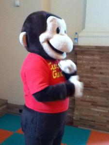My reaction was an email reply to Sarah at the BBF saying, “OH MY GOSH! OH MY GOSH! OH MY GOSH!! I can’t believe I got picked to be a character. It’s like a lifetime dream come true! Thank you!!” a response that neither hid nor exaggerated my excitement. Really. This was a big deal for me. Several weeks passed before I learned my assignment (Curious George). I watched YouTube videos to prepare myself – method acting, you know. I practiced George’s dance moves and tried to absorb his mischievous nature. I dodged a last-minute change in schedule that tried to thwart my big day, and come 3:45 on Saturday afternoon, I donned the sweaty padded under-suit, the furry overcoat, the bright red t-shirt with “Curious George” in yellow script across the front. I put on the big feet, the expressive hands, and, of course, the head, and I headed up from the basement level of the Boston Public Library to the awaiting throng of children and adults alike.