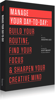 Manage Your Day-to-DayI’ve been reading a book this week entitled, Manage Your Day-to-Day: Build Your Routine, Find Your Focus, and Sharpen Your Creative Mind (ed. by Jocelyn K. Glie). It’s the perfect Kindle book for those times when you’re forced to spend hours in the dentist’s chair and on the couch, battling a nasty infection. It’s a great collection of tips from a lot of recognizable voices in the creative world. A product of 99U, the brainchild of Scott Belsky and his company, Behance, it’s a web-based clearinghouse of all things for creatives. Personally, I’m hanging my hat on the idea that creativity will be the thing that fixes and/or saves a lot of things in our society and workplaces, and if not, learning about it and adopting many practices of creatives makes me feel a lot better about myself and my work, so if for no other fact than that, I keep up.