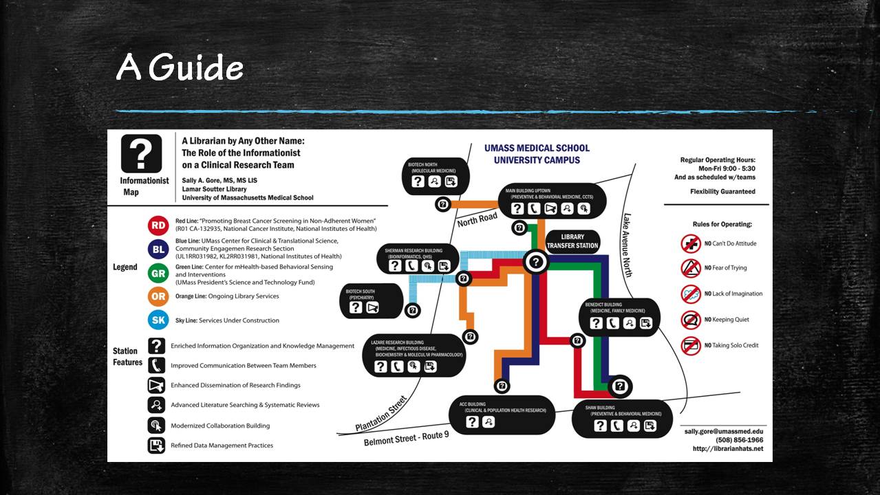One of the reasons that I’m invited to speak on this subject is because I do it. Since we received a grant from the National Library of Medicine to embed informationist services into an existing research study/team, I’ve been charged with developing and expanding these same services across our campus. I’m happy to report that it’s been a successful couple of years, as you can see from my campus map that shows all of the projects, connections, routes, and services that have come to be. I’m also happy to report that the “under construction” line is now complete. We received word recently that our latest proposal for grant funding to bring informationist services to a large neuroimaging project on campus has come through. I’ll be starting work on that very soon.