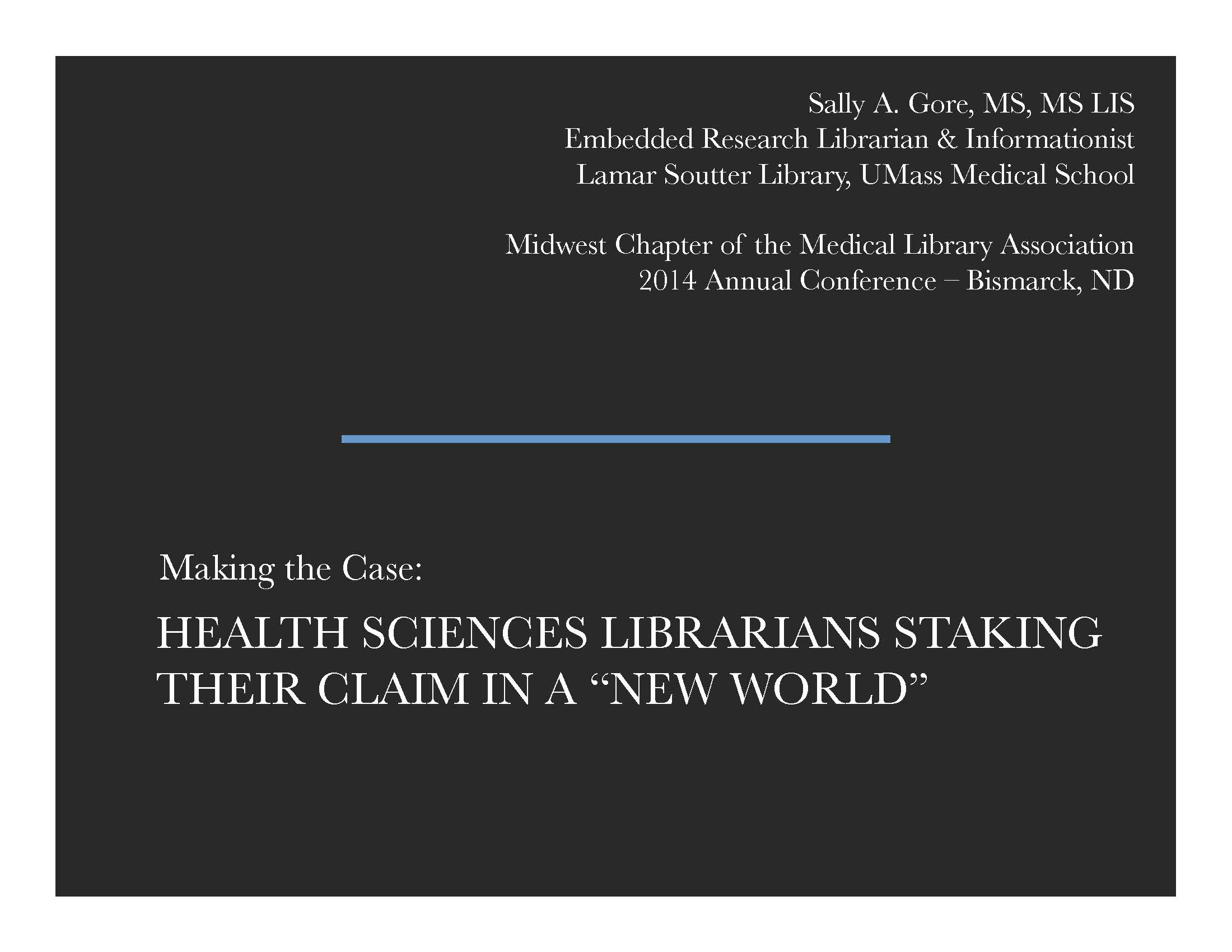 I titled my own keynote, “Making the Case: Health Sciences Librarians Staking their Claim in a ‘New World.'” You can download the slides here, but I’ll provide an annotated version of the talk in this post.