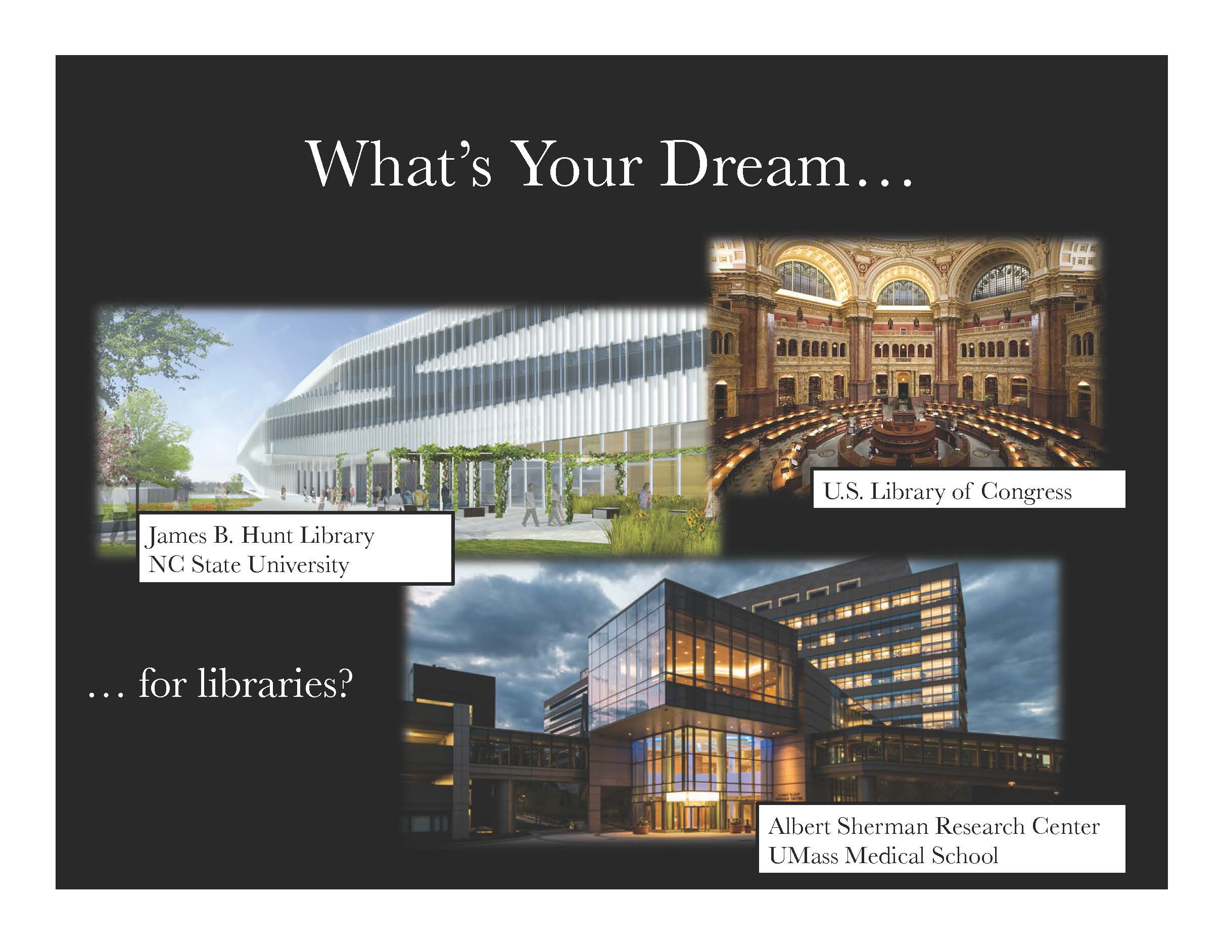 So, what’s your dream for libraries? When you think of what a library is and/or can be, what do you dream? Do you imagine the “Library of the Future,” complete with no books and lots of modular furniture, spaces for gaming and tools to help students and faculty and researchers fuel their innovative spirits? Do you dream of tranquility and order and the beauty of our National treasures, like the Library of Congress? Or do you see the library as not a place at all, but people embedded in research centers, bringing the services of libraries directly to the patrons?