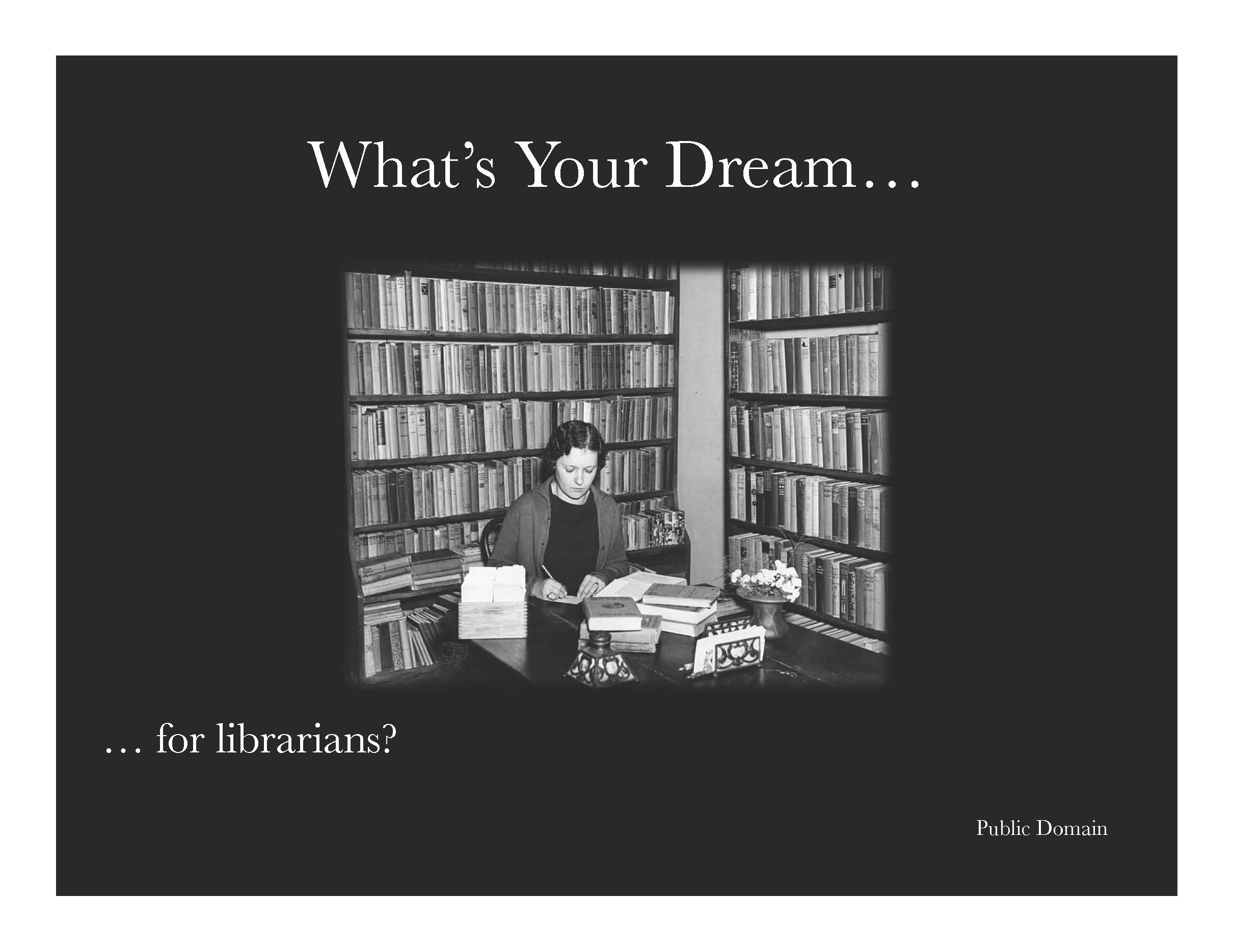 And what do you dream for librarians? Do you miss the “good old days” when we held the keys to the information kingdom; when we were the gatekeepers that everyone had to pass through and by in order to access what they needed? Do you miss the heady power of those days? Or do you dream of times when librarians are no longer associated with libraries; when we’re not even called librarians anymore? What do you dream?
