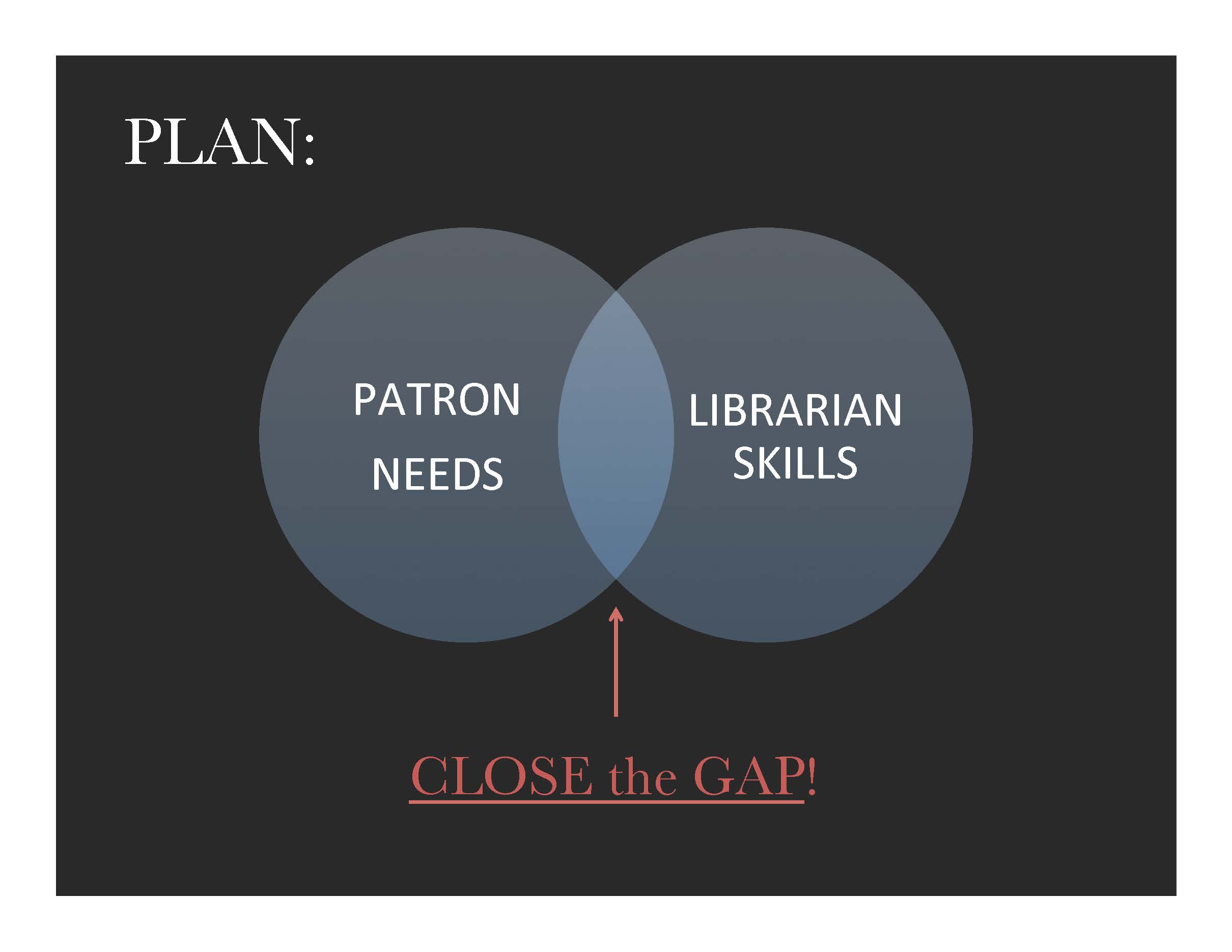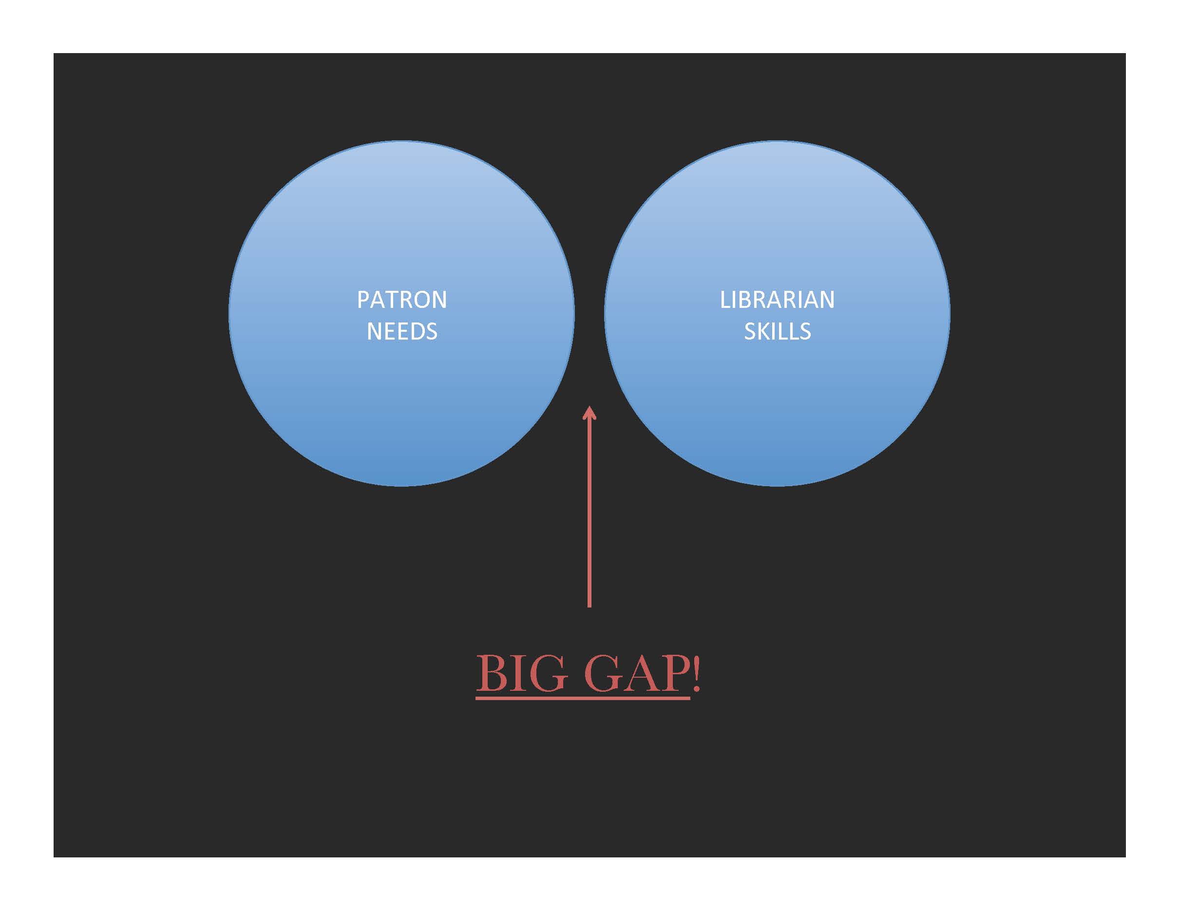 We talk a lot in our profession about the gap between what students, faculty, staff, and researchers want from health sciences libraries and what health sciences librarians know how to do. We’re very focused upon identifying the skills that we need to develop to close this gap and become, again, a vital and relevant resource to our patrons. The gap produces a great deal of anxiety for many of us; we don’t know how we’ll ever keep up, ever gain the skills we need, and/or ever meet our patrons’ needs again.