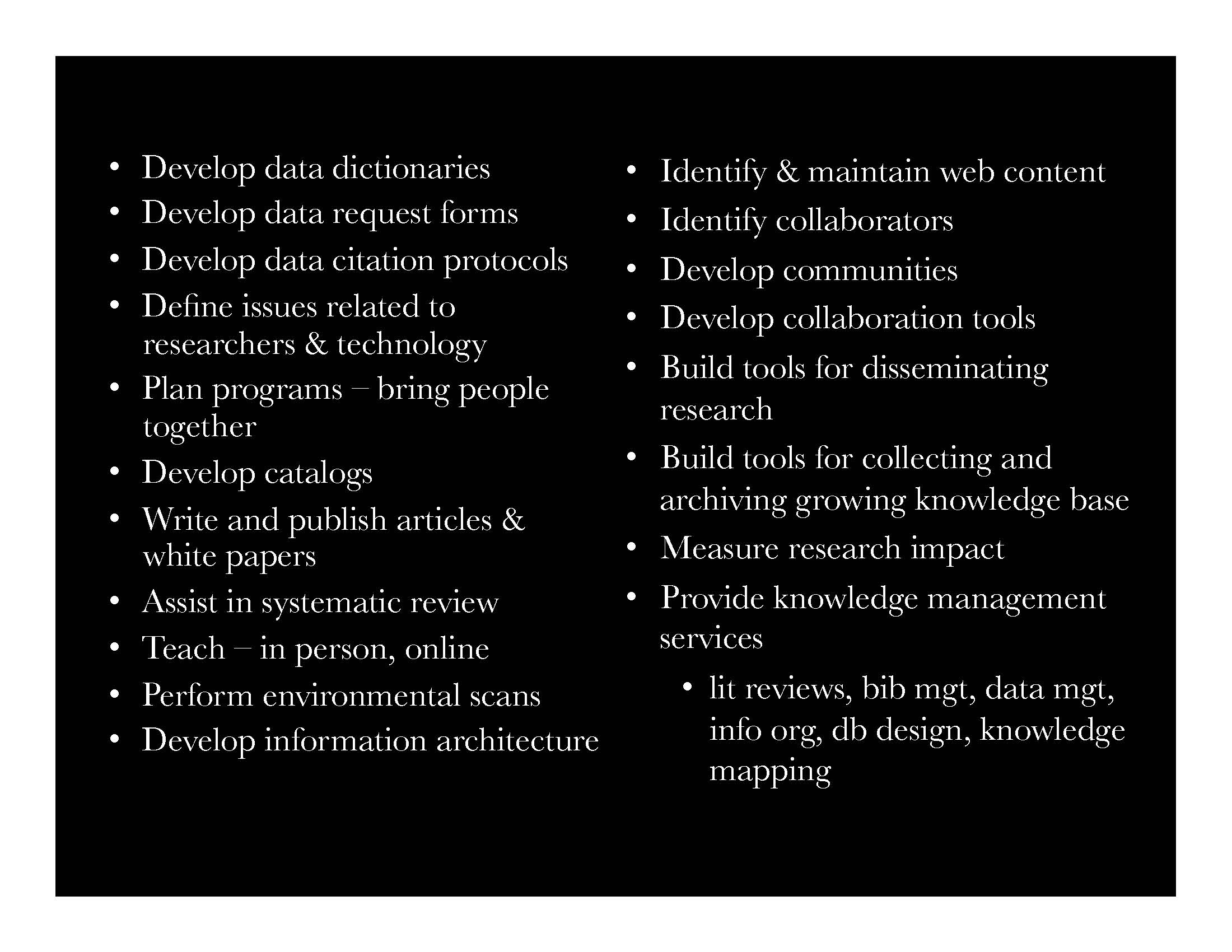 And then, take that list and from it create another list of all of the many, many, many things that you know how to do. Yes, you’re a librarian and you have a whole host of skills that come with that, but think of others. Think of how all of the other things that you’ve done in your life have helped you gain expertise in information management or communication or team building or organization. And once you have that list, look around you at all of the many, many, many needs your current environment offers. Can you now, with all of these lists in hand, find one or two or a dozen matches, opportunities where you can put yourself, the librarian, to good use to meet these needs? As Betsy Humphreys noted in her talk, these opportunities are our POINTS OF DEPARTURE. They are our keys to relevancy and the future of our profession.