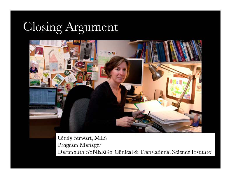 For my closing argument, I offer up my good friend, Cindy Stewart. If you’re a medical librarian, you may well know Cindy, for up until just a few weeks ago, she was an Associate Director for the health sciences library at Dartmouth’s medical school. Today, though, she’s the new Program Manager for Dartmouth’s Clinical and Translational Science Award. Do you think she stopped being a librarian, simply because she assumed this new position? NO. Do you think that she got this position in large part because of all of the skills she honed over the years as a medical librarian. YES. Cindy was able to sell herself as the person for this job because of all of the things that she knows how to do, from being a librarian, that fit all of the information needs (and more) that the researchers at Dartmouth and their CTSA program have and/or are going to have over the next few years. She closed that gap, but good.