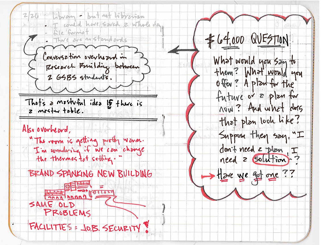 On my embedded days, when I’m not in meetings, I often search out a quiet spot somewhere on campus (not in the Library) where I can work uninterrupted. We have a new research building on campus and during this transition time when people are slowly moving in to the new lab spaces and the cafeteria has yet to open, there are many good places that fit the bill. Yesterday morning I was sitting in what will eventually be a bustling lunch area, preparing for the weekly team meeting, when a few students came and sat at a nearby table. Recalling an assignment that I once had for a writing class, I eavesdropped on their conversation and took a few notes. They looked like this: