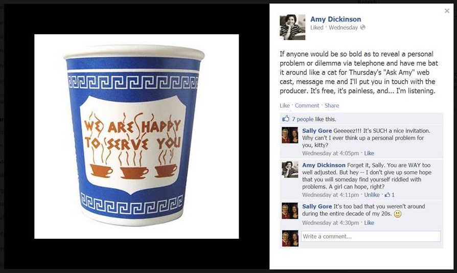 As mentioned earlier, I’m also a fan of Amy Dickinson, the Amy of the syndicated advice column, “Ask Amy.” We also “met” through Twitter and I take part in the discussions she tosses out on her Facebook page. She’s promised to take part in my “Jam 51” birthday party, if she can. Maybe the folks in Freeville are unimpressed, but not me. I’m counting on the face-to-face meeting in the future. In the meantime, I’m working up some turmoil in my life so that I can call into her Thursday noontime webcast from the Chicago Tribune. And look! She’s hoping for the same. 🙂